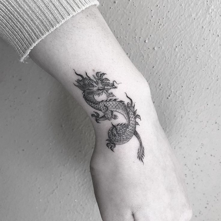 Выполняют татуировки любыми техниками и размещают на любой части руки. Монохромное исполнение идеально подходит для минималистичных татуировок. Маленькие дракончики на пальцах, ребре ладони, тонкие браслеты в виде этого змея на запястье или на руке выше отлично смотрятся без колеровки.