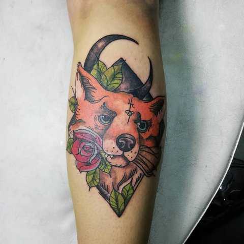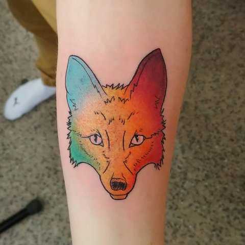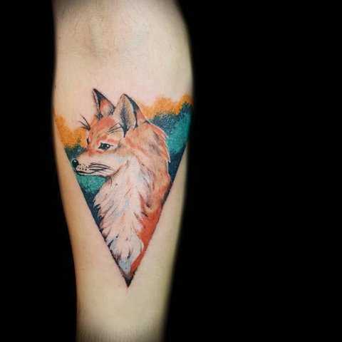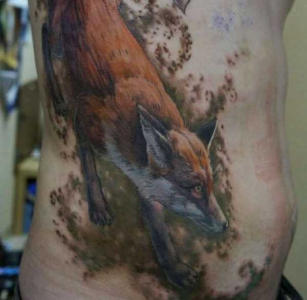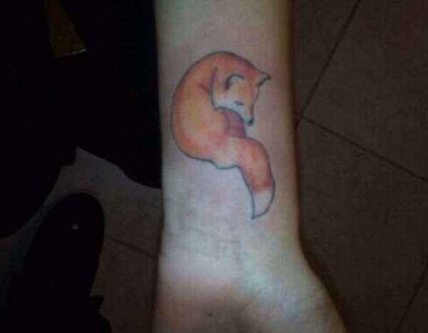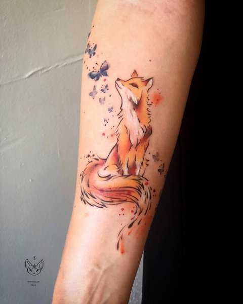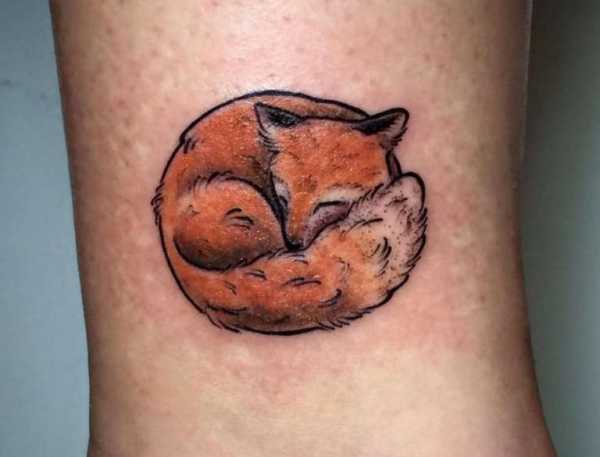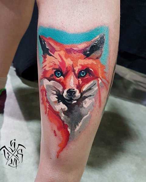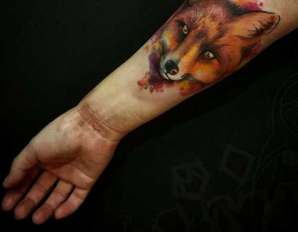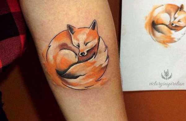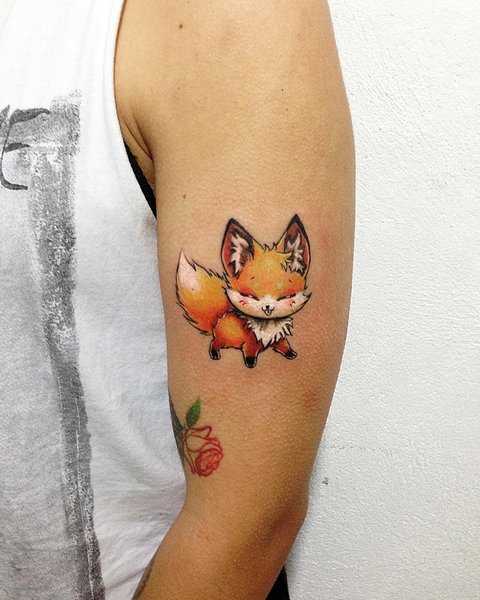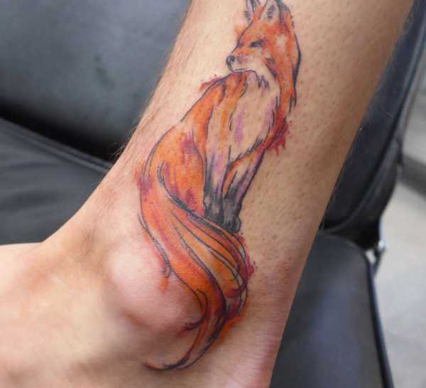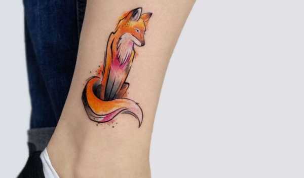 Цветные тату очень нравятся девушкам. Картинка не обременена глубоким смыслом, подойдёт всем любительницам животных и забавных персонажей. Маленькая лисичка найдёт себе место на ноге или на запястье.