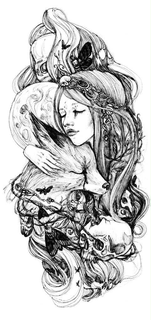 Красивый женственный эскиз без устрашающей конкретики. Формат позволяет набить такое тату на бедро, смотрится очень эффектно.