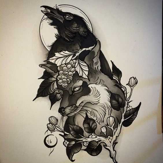 Ворон испокон веков обвит ореолом таинственности и связи с магическими силами. Нередко такие чёрно-белые тату напоминают об одиночестве или ушедшем человеке.