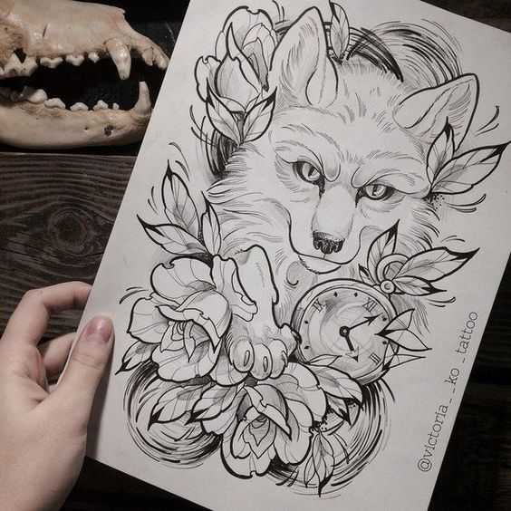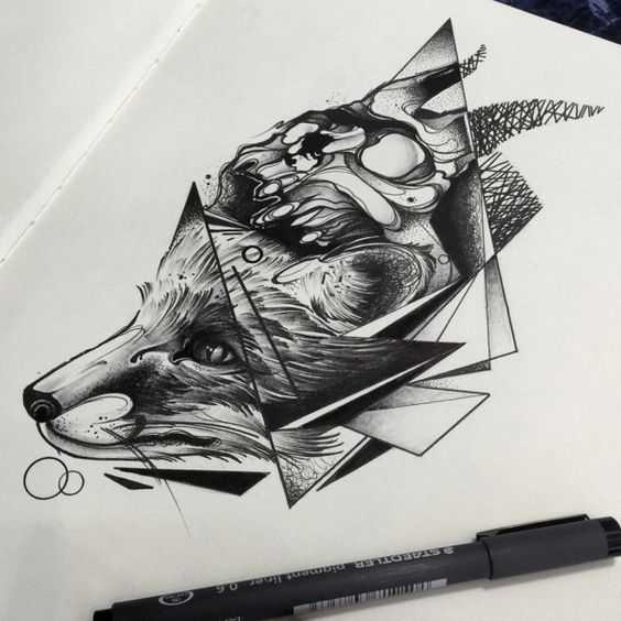 Эскиз в стиле реализма. С первого взгляда привычный набор: лисья голова с цветами и … череп разделённый надвое. Кого такая подача не пугает, может смело решаться на эксперименты.