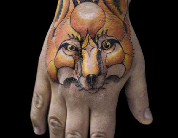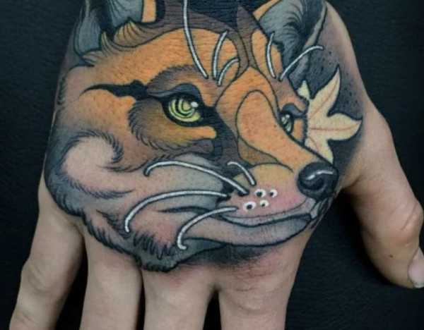 ИсточникМужская тату лиса с хитрым взглядом на руке.