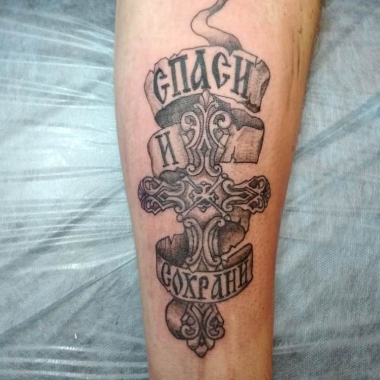Православный крест – символ христианской веры, символизирует единство отца, сына и духа святого. Если на кресте изображен распятый Иисус, такая тату служит владельцу напоминанием о мученической смерти и учении Иисуса.