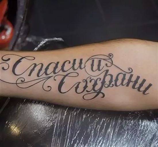 Изначально, татуировки надписи имели религиозный характер. Чаще всего писали на латыни. Стандартными фразами для тату были: «Спаси и сохрани» и «Бог с нами». Иногда исключение составлял испанский язык. Важно отметить, что церковь не выступает против татуировок, если они не противоречат религии. В прошлые века, когда туземцев крестили насильно, им набивали татуировку в виде креста. Данную традицию сохранили во многих странах, и сейчас существует более ста различных ассоциаций религиозных татуировок.