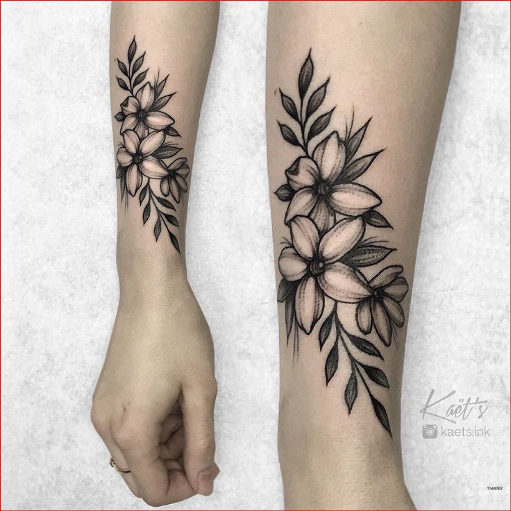 Рисунок лучше всего украсит предплечье, запястье, щиколотку. Изящно смотрится тату-ветка на рёбрах. Ещё один необычный вариант для оформления рисунка – имитация колье на шее.