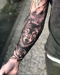 Интересно смотрятся контуры животного или только голова в реалистичном стиле, обрамленная цветами. Девушки обычно выбирают яркие изображения, но хорошо смотрится и черно-белая татуировка волка на предплечье, груди, ноге, лопатке, словно равновесие добродушия и агрессии, светлых и темных сил, символ выбора.
