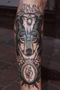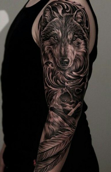 - Рисунок животного – воплощение смелости, выносливости, мужества, великодушия, чести, мудрости. Гордый, уверенный в себе зверь с понимающим и пронзительным взглядом изображается на тату волка с перьями или индейцем. Интересно смотрится картинка, где половина мордочки животного плавно переходит в облик вождя племени.