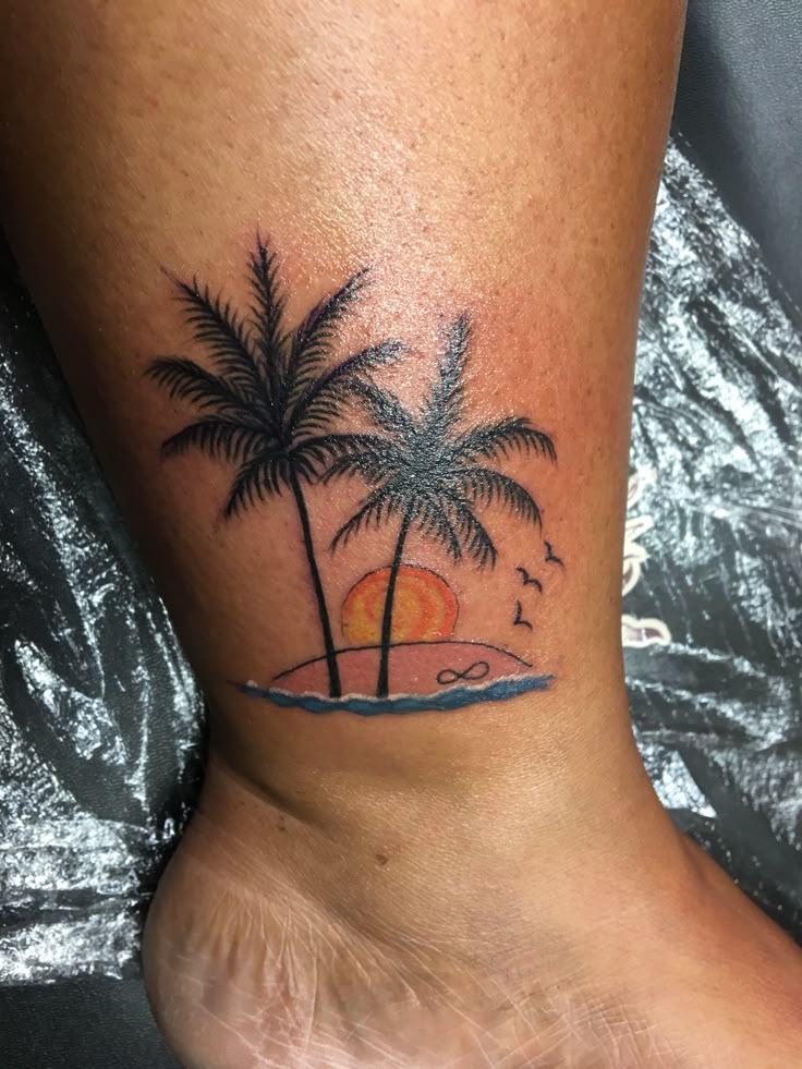 Тропический регион неполноценен без солнца. Татуировка с затененной пальмой показывает красивые оттенки солнца и его отражение в воде. В основном это портреты на закате; молодежи нравится пробовать этот дизайн для своего мировоззрения.