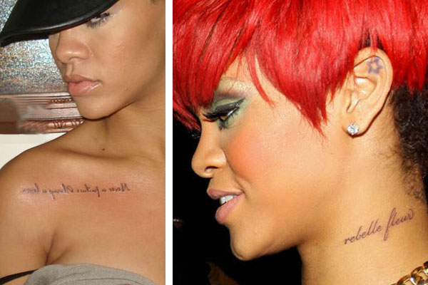 14. 9 августа 2010 Rihanna и ее парень Matt Kemp посетили тату салон в Нью-Йорке, где певица сделала очередную татуировку, на этот раз с левой стороны шеи в виде надписи на французом «Rebelle Fleur», что значит «мятежный цветок».