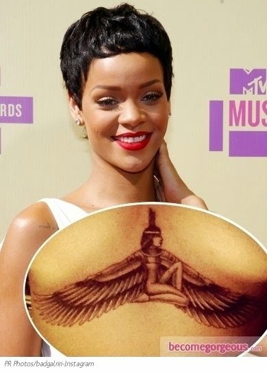 Это еще один великий символ Рианны. Это татуировка Богиня Исида, где видно, как он расправляет крылья.