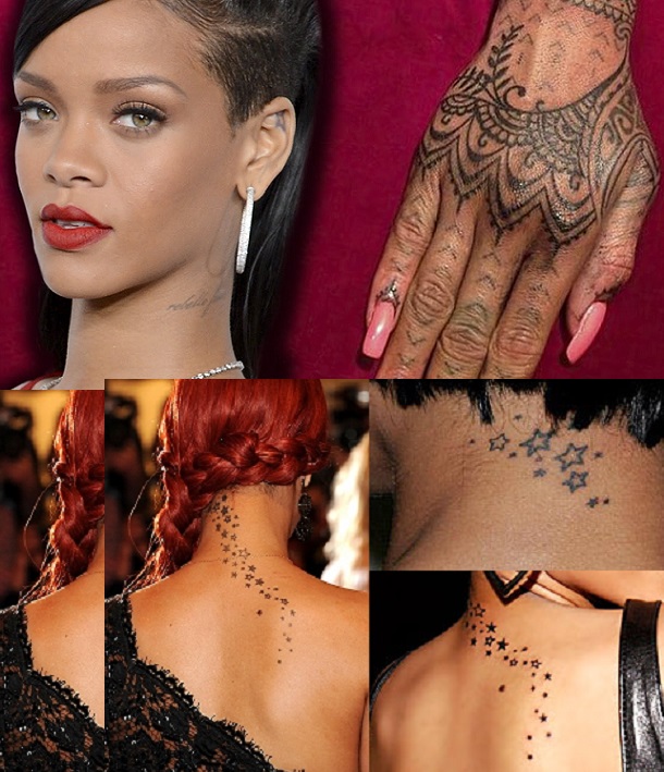 Татуировка Рианны в виде звезд сначала имела незначительный размер, покрывая только шею, далее, в 2008 году, продолжилась от затылка до спины. Тату Рианны звезды можно считать наиболее популярной и женственной татуировкой уже несколько лет подряд.