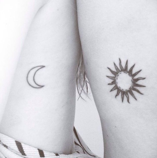Солнце и луна Солнце и луна чаще всего изображаются в тандеме. Это распространенный сюжет татуировки, который указывает на мужское и женское начало — так символически на тату присутствуют бог солнца и богиня луны. Из-за этого рисунок часто выбирают для парных татуировок.
