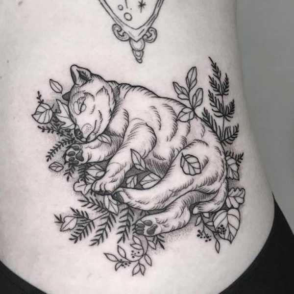 Придать оригинальность тату поможет добавление изображений и символов. Луна, горы, лес, цветы или перья будут удачным дополнением изображения хищника.