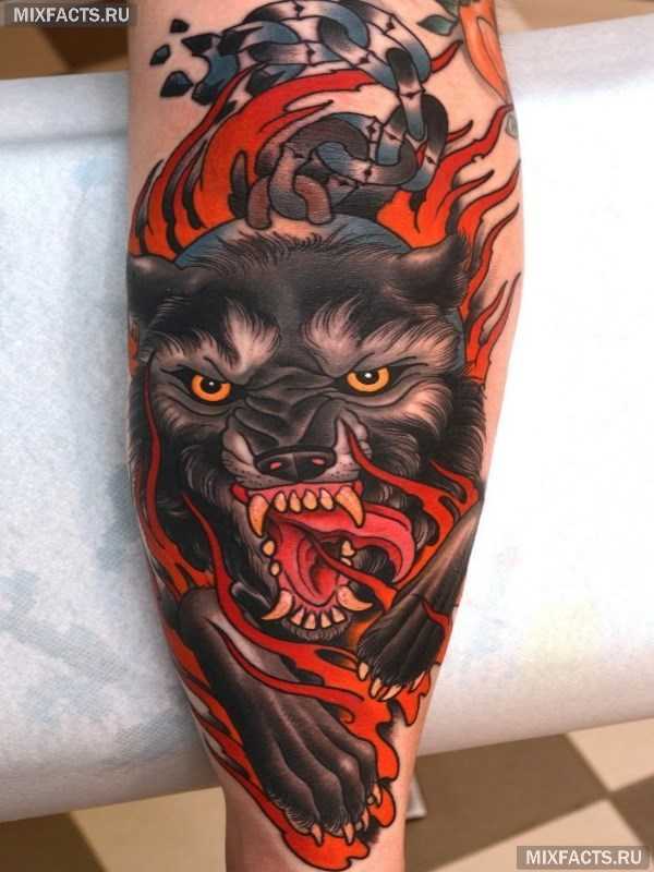 Волк, изображенный в огне, сообщает о связи владельца тату с темными духами. Животное, в этом случае, является проводником в потусторонний мир. Поэтому при нанесении такой картинки на свое тело, следует внимательно взвесить все «за» и «против».