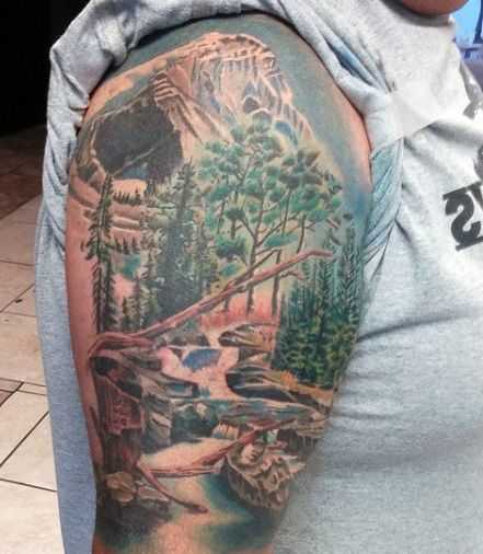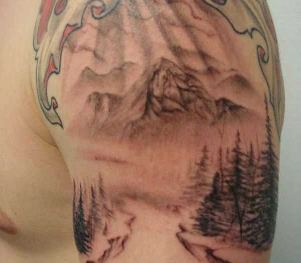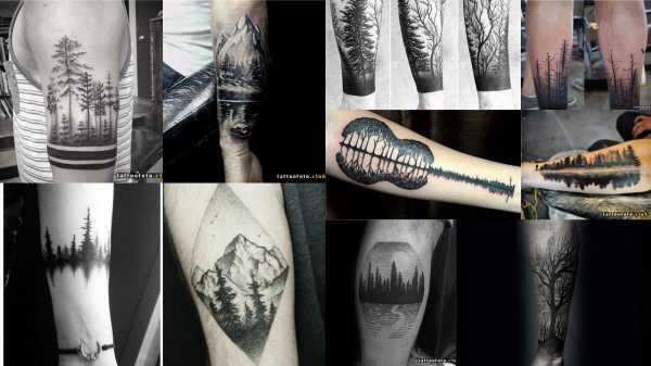 Пейзажи, которые наносят в виде тату, очень популярны сегодня. Особым спросом пользуется лесной пейзаж. Из-за своей масштабности лес обычно размещается на груди или спине, однако встречаются умельцы, которые наносят изображение на руку или ногу.