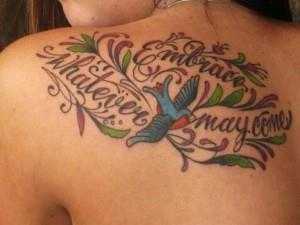 Иногда татуировка ласточки сочетается с надписью, имеющей особое значение для человека.