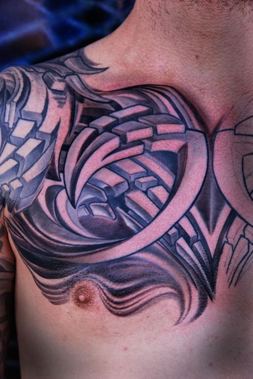 Биомеханические татуировки — один из самых популярных дизайнов для мужчин. Человеческий разум был очарован идеей слияния человека и машины задолго до того, как Арнольд стал Терминатором. 3D-конструкции со сталью, шестернями и проволокой, которые, кажется, превращают мужские тела в машины, были в моде. Иллюзия кожи и вен, встречающихся с проводами и шестернями, особенно когда она нарисована на очень подтянутом и мускулистом парне, может свести с ума.
