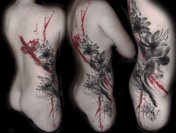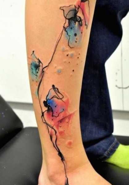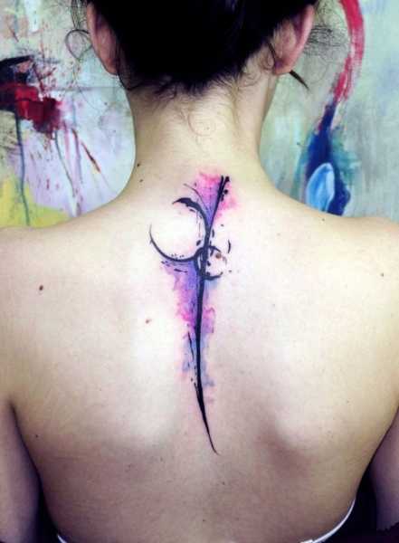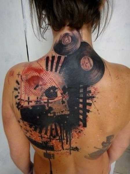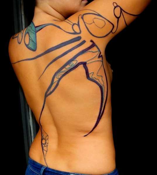 На сегодняшний день абстракция выполняет в основном декоративную роль. Для ее исполнения используется большое количество оттенков, сочетания линий, предметов, цветовых переходов. Она может быть также выполнена в одном цвете. Эти рисунки выгодно смотрятся на спине, трицепсах, щиколотках.