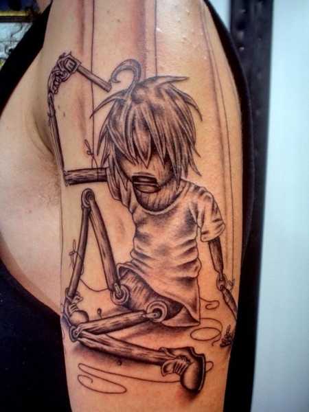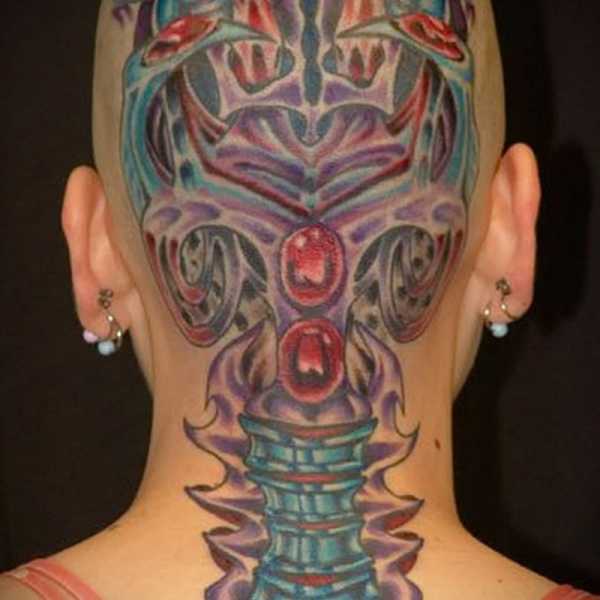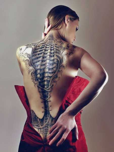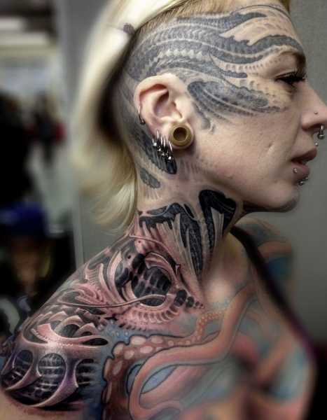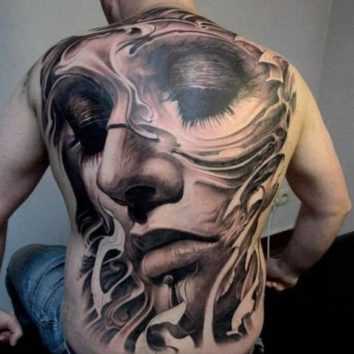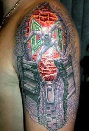 В настоящее время – это самое востребованное направление. Сложность отображения биомеханического узора создает поразительную иллюзию оптического обмана. Такой рисунок может сделать только специалист высочайшего класса. Показать связь машины и человеческого тела – главная задача такой татуировки.