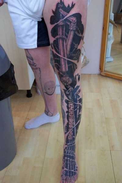 Подбирая эскиз тату на ноге, необходимо учитывать ограниченную область участка тела. Это относится и к рисункам, которые будут наноситься на руку и запястье. Симбиоз металла и живого организма будет очень эффектно смотреться на спине.