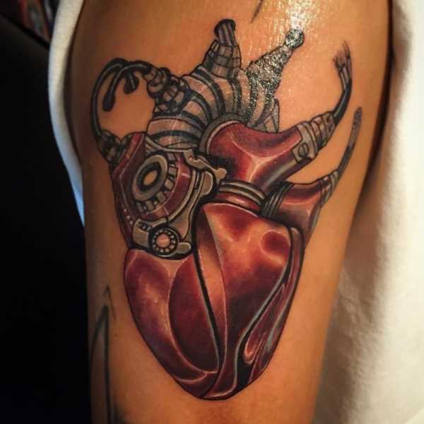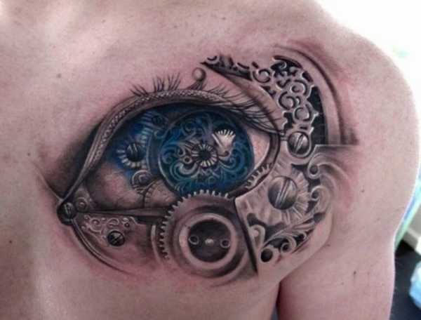 Чаще всего сюжеты с изображением элементов механики, выбирают мужчины. Грубые и устрашающие рисунки, вырезанные или развернутые края кожи, из которых торчат провода и металлические фрагменты механизмов, могут взбудоражить сознание любого человека. Благодаря тому, что при работе активно используются краски, татуировка выглядит очень реалистично.