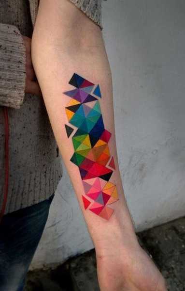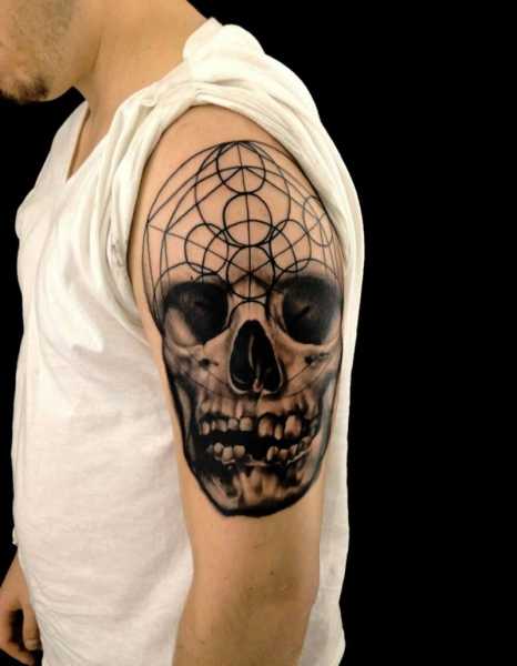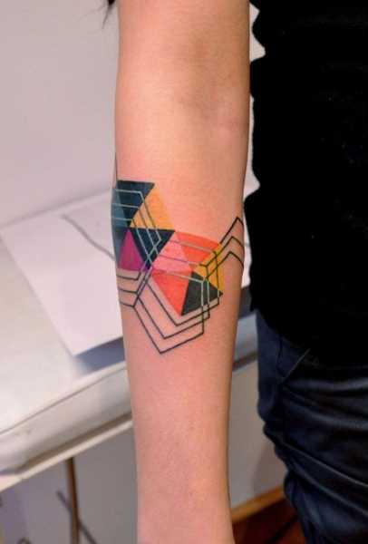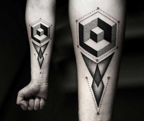 Основу эскиза в этом стиле создают геометрические фигуры, но просто куб или конус – это скучно. Сплетение линий в единое целое – основное условие геометрического тату. Настоящий художник может превратить обычный цветок или женскую фигуру в необычное геометрическое изображение.