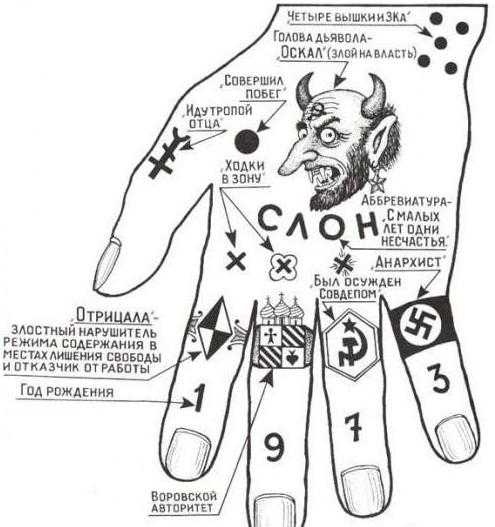 Подобная татуировка является характерной для советских и некоторых российских заключенных. СЛОН – аббревиатура – тюремная наколка, которая состоит из четырех букв.