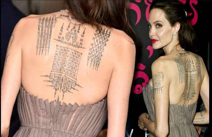 Татуировки на спине Анджелины Джоли: Ее татуировки на спине менялись много раз, а также добавлялись, как и на руках. Раньше у нее был японский кандзи, означающий смерть, на левом плече, но теперь он покрыт подробной молитвой о защите буддийского происхождения. Благословение на санскрите, но написано камбоджийским шрифтом в честь ее первого ребенка – усыновленного Мэддокса.