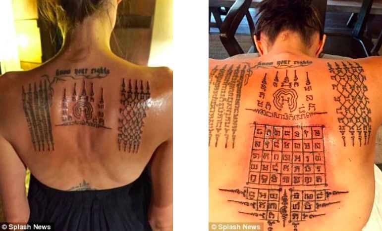 На свой левой лопатке она разместила надпись, если быть точнее, то это заклинание на кхмерском языке, хотя издалека это похоже на след после удара тигрицы. Это тату — заклинание буддийского пали с оберегающей целью ее и ее приемного сына Меддокса от неудач.