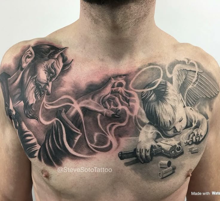 Тату на груди у парня – ангел, дьвол и сердце в цепях