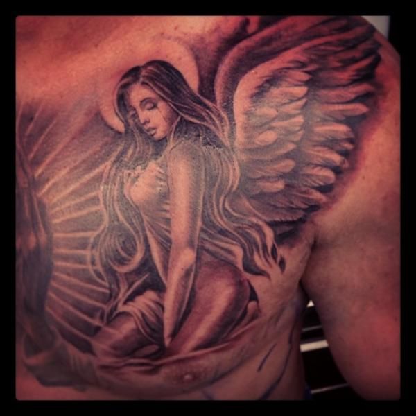 Красивая тату на груди у парня – ангел в виде прекрасной девушки