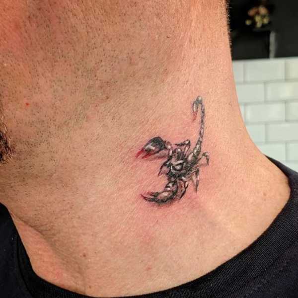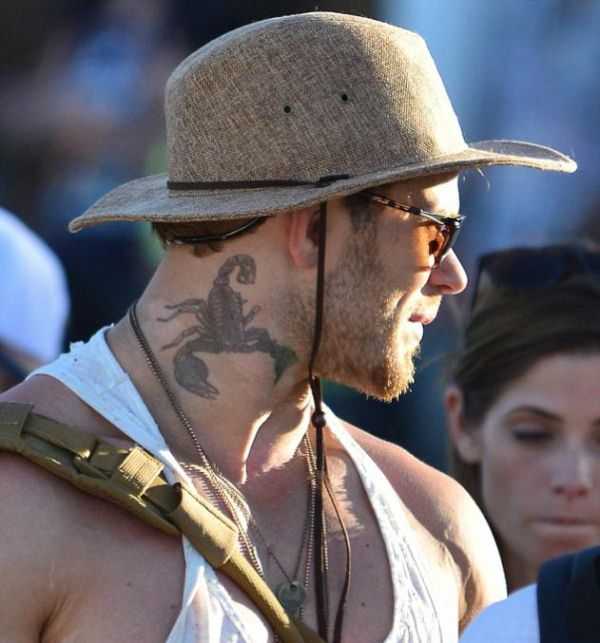 Мужчины выбирают более крупные эскизы, поэтому для нанесения рисунка требуется более обширные области тела. Наиболее часто, мужские тату скорпиона располагаются на шее, на плече или на груди.