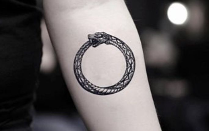 Уроборос Платон описал как изначальное космическое существо, находящееся в состоянии самопожирания. Это символический змей из Древнего Египта и Греции. Он представлен с хвостом во рту, постоянно пожирающим себя и возрождающимся из самого себя. Уроборос выражает единство всего материального и духовного, которые никогда не исчезают, но постоянно меняют форму в вечном цикле разрушения и воссоздания.