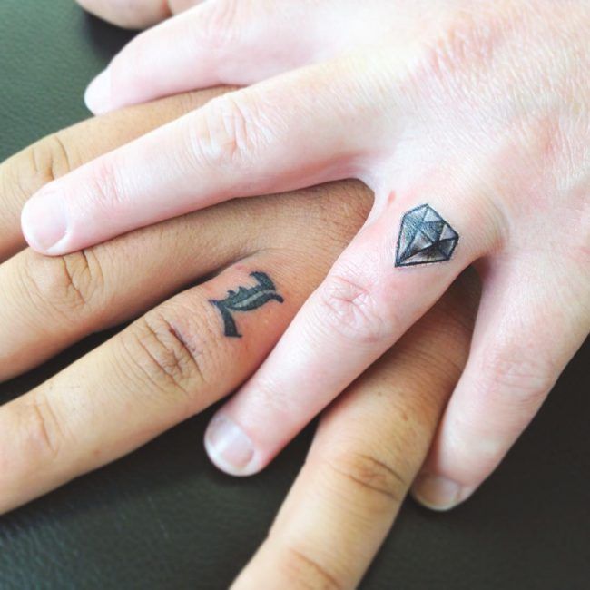Бриллиант очень популярен в парных тату, потому что именно этот камень обычно украшает обручальные кольца. Влюбленные накалывают драгоценность на безымянные пальцы или участок между указательным и большим. Такое тату приобретает значение верности, преданности, честности и постоянства. Пары показывают искренность своих чувств и уверенность в том, что их любовь вечна.