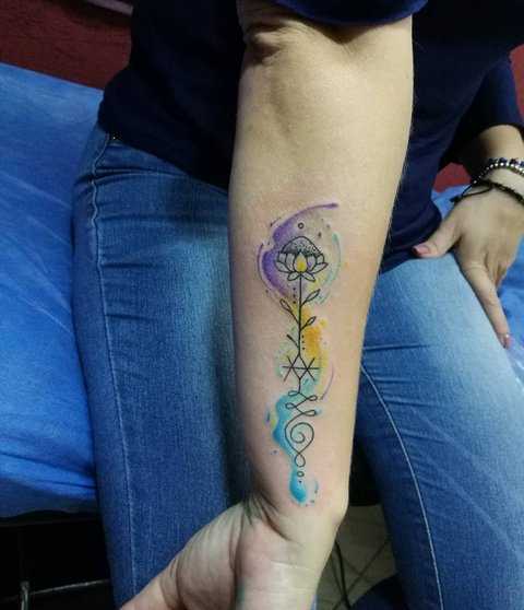Чаще всего, колесо Дхармы изображают на теле в цвете, выделяя каждую из спиц своим оттенком. Такая тату станет прекрасным украшением предплечья или запястья.