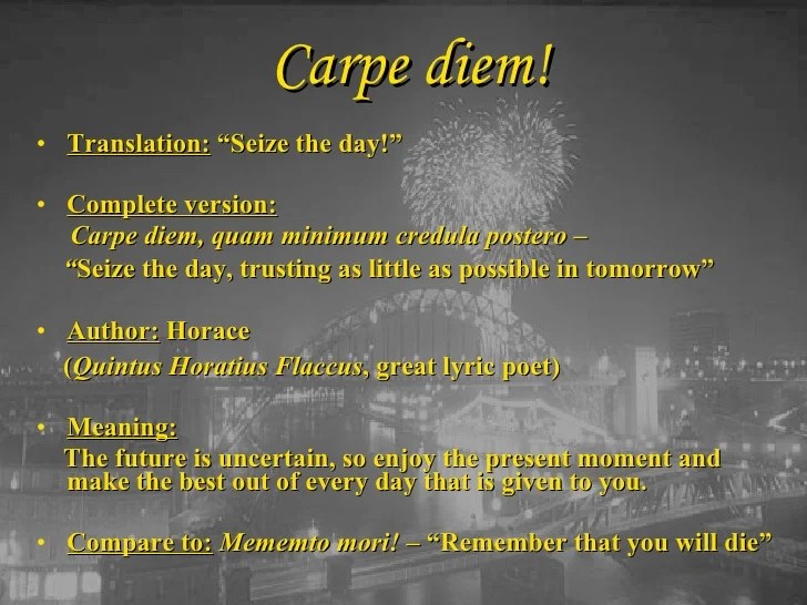 Carpe diem является частью предписания Горация «carpe diem quam minimum credula postero», которое появляется в его Odes (I.11), опубликованном в 23 г. до н. э. Дословно его можно перевести как «сорвать день, как можно меньше доверяя следующему». Фраза carpe diem стало обозначать весь судебный запрет Горация, и он более широко известен как «лови момент».