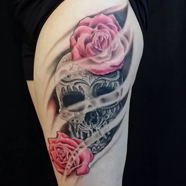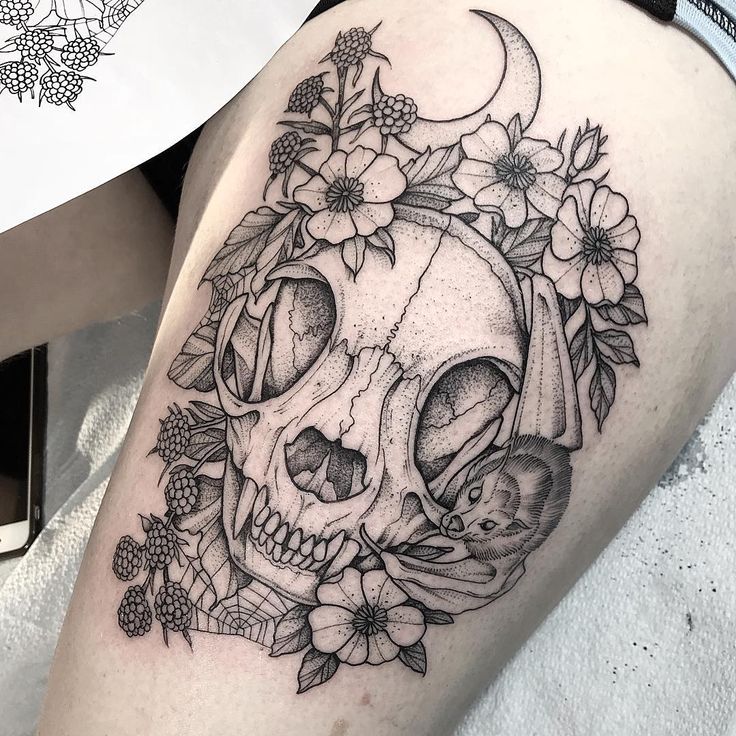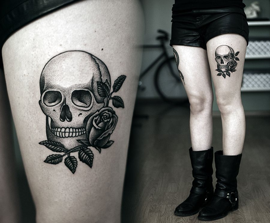 Любительницам нарядов с глубоким декольте подойдет татуировка черепа с крыльями либо цветочными лианами на груди. Это смотрится привлекательно и загадочно. Наколка с яркими оттенками, замысловатым орнаментом украсят руку либо бедро.