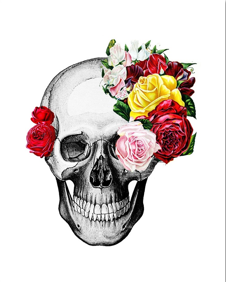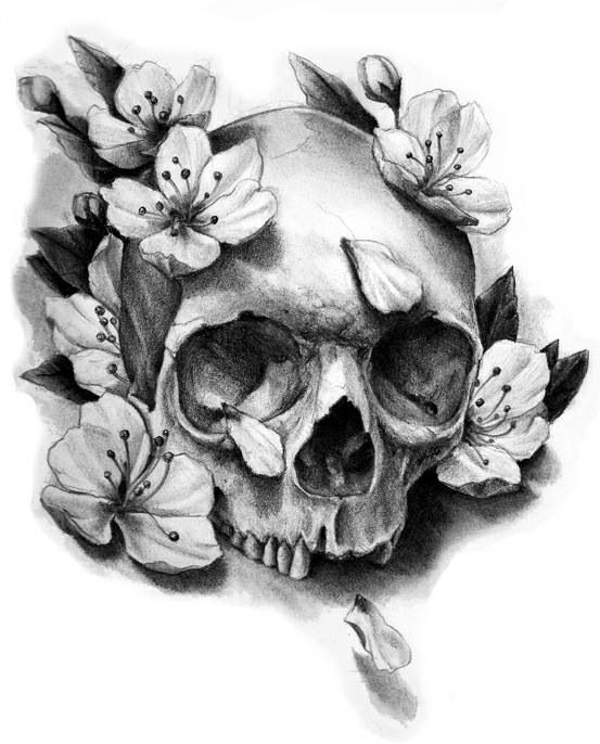 - С другими цветами. Используются и другие цветочные композиции. Конкретный цветок обладает определенным смыслом. Лилии означают невинность, скромность и честь, яблоня — признак расцвета в жизни. Выбирают подобное сочетание молодые девушки. Композиция несет позитивное значение. При этом череп может даже затеряться в обильном цветочном орнаменте.