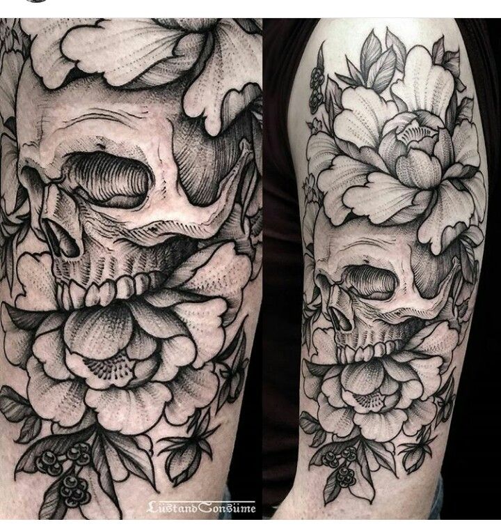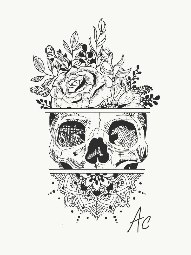 Если изображение крупное, сочетающее несколько символов, будет удобнее расположить его на спине. Удлиненный череп с обхватывающими его цветами и растениями считается женским эскизом. Наиболее выгодные места для реализации эскиза на коже девушек – стопа, голень, кисть.