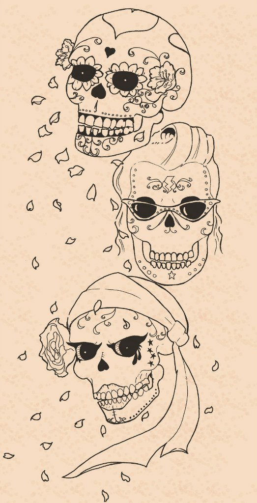 Для сахарной головы лучше выбирать полно — цветные варианты. Чем ярче краски, тем нарядней смотрится эскиз. Группа символов с включением черепа: