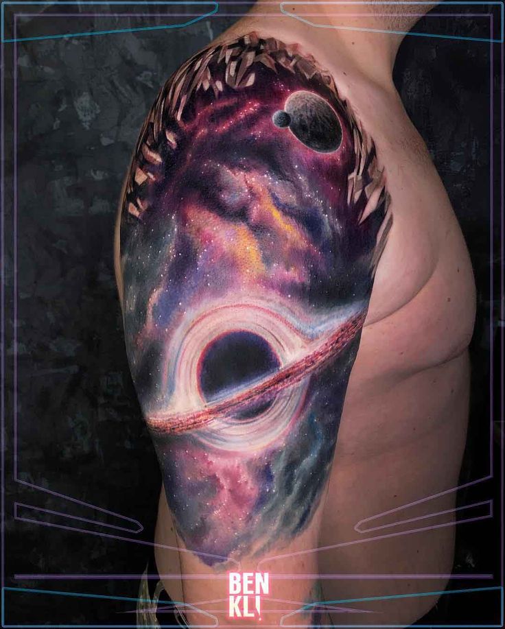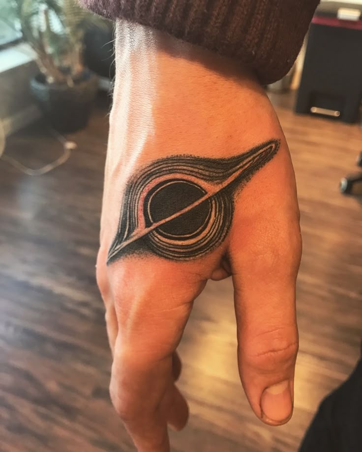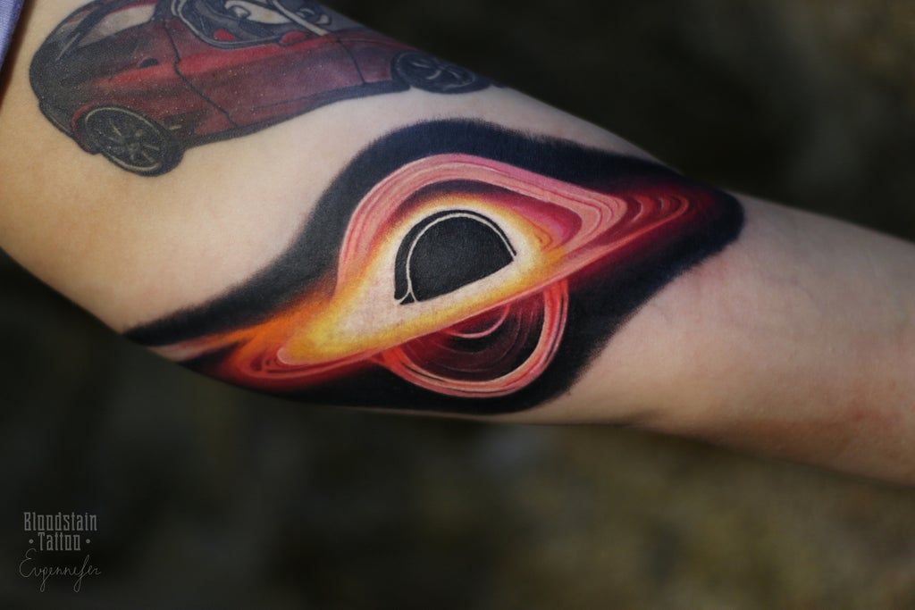 В эскизах и татуировках на тему космоса, планет, звёзд прежде всего необходимо уточнять — в черных дырах нет аккреционного диска! В то время как при изображении сверхновой звезды, предзвезда медленно формирует аккреционный диск, со своим вращением. Форма вращающейся материи – это ионизированный Газ, то есть горячая и концентрированная структура атомных элементов (квантов). Это 4-я форма консистенции, Плазма. (99% нашей Вселенной состоит из холодной плазмы, поэтому межзвездное пространство не пустое).