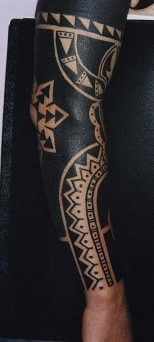 Размеры рисунка могут быть различными, но стоит учитывать, что маленькие узоры в этом стиле не очень уже смотрятся. Конечно, залитый черной краской круг на руке будет заметен, но узора тянущийся от плеча до запястья, переливающийся сочетанием кожи и цвета смотрится намного круче.