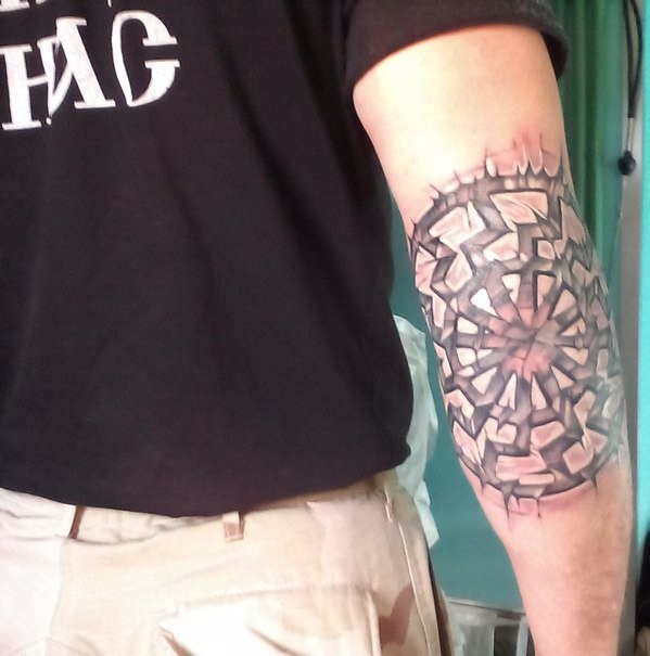 Идеальный вариант — черное солнце на локте. Татуировка защитит владельца от негативного влияния, просветлит разум. Правильная картинка в этой зоне подразумевает центр символа на самом локте, от которого расходятся лучи.