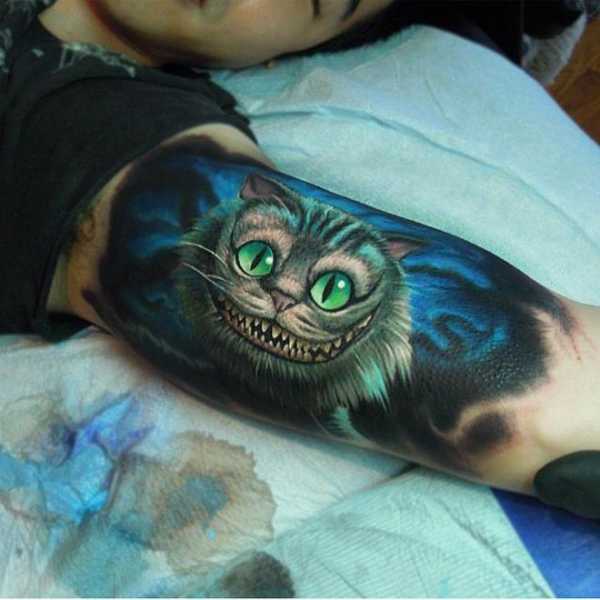 А вообще Чеширского Кота часто набивают просто жизнерадостные и активные люди. Ведь этот персонаж одним только своим внешним видом мгновенно поднимает настроение и внушает оптимизм. Самое главное перед тем, как набить татуировку – подобрать хороший эскиз и грамотного, талантливого мастера. Работа не из простых, специалист должен быть настоящим художником и высококлассным мастером, чтобы сделать все технично и качественно.