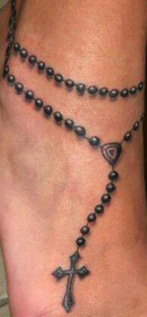 Другие татуировки с четками оборачиваются вокруг лодыжки в виде браслета на щиколотку. Иногда крест драпируется на верхнюю часть стопы. Этот стиль дизайна, кажется, очень популярен среди женщин.