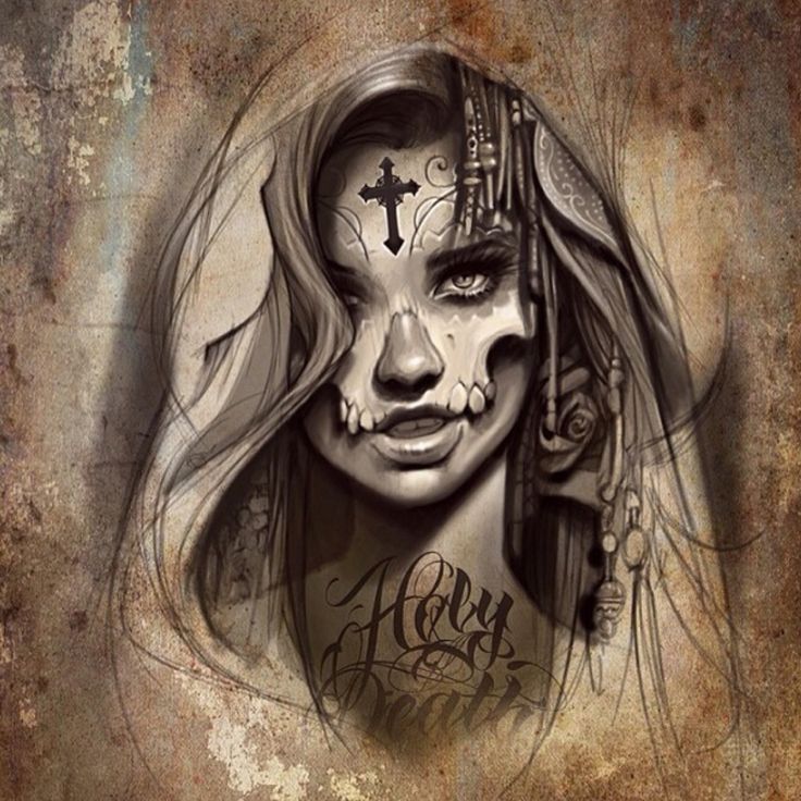 На женских телах сегодня часто можно увидеть мужские эскизы. С помощью тату в стиле чикано представительницы прекрасного пола показывают личные убеждения и сильный характер. В моде тату «Санта муэрте» (в переводе – святая смерть). Эскиз выполняется в виде лица девушки и черепа.