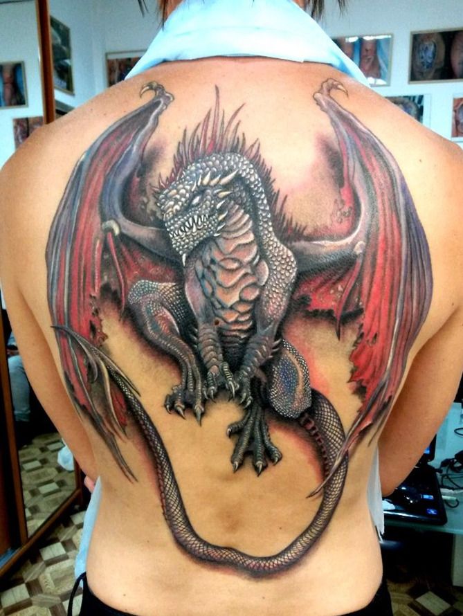 Самое оптимальное полотно для нательного рисунка — спина, особенно для тату дракона в японском стиле. Здесь можно нанести целый сюжет, прорисовать каждую деталь, передать все величие картины. Мужчины в основном предпочитают более агрессивное изображение, особенно в красных и черных оттенках.