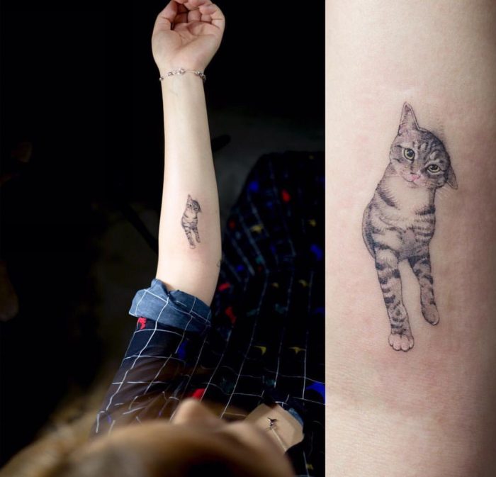 Чаще всего можно наблюдать улыбающуюся мордочку кота на руке. Его набивают на предплечье, изображение украшает плечо. Второе по популярности место на ноге. Оскал кота украсит икру у мужчины и бедро у девушки.