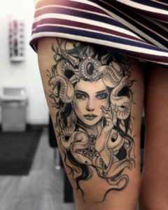 В искусстве тату, большой популярностью пользуется изображение Медузы Горгоны. С мифологии нам известно, что Медуза Горгона является чудовищем, вместо волос у которого ядовитые змеи. Но, как гласит легенда о Горгоне, она не всегда была чудовищем. Согласно легенде, у морских божеств Кето и Форкия было три дочери: Сфено, Эвриала и Медуза. Все три сестры были обладательницами неземной красоты. Одна из трех сестер – Медуза, очень нравилась Посейдону, он желал овладеть неземной красавицей. Но Медуза отказала владыке морей, и Посейдон против воли красавицы, овладел ею в храме Афины. Афина была невероятно зла, и посчитав виновной в данном инциденте Медузу, она превратила ее и ее сестер в страшных чудовищ. Из красавиц, девушки превратились в ужасных существ: они покрылись чешуей, у них выросли желтые клыки, вместо ногтей на руках были стальные когти, а их волосы превратились в змей. Но самым большим наказанием являлся взгляд, который превращал всех смотрящих в камень. С тех пор Горгона погубила множество душ, пока ее не одолел Персей.