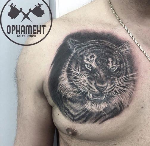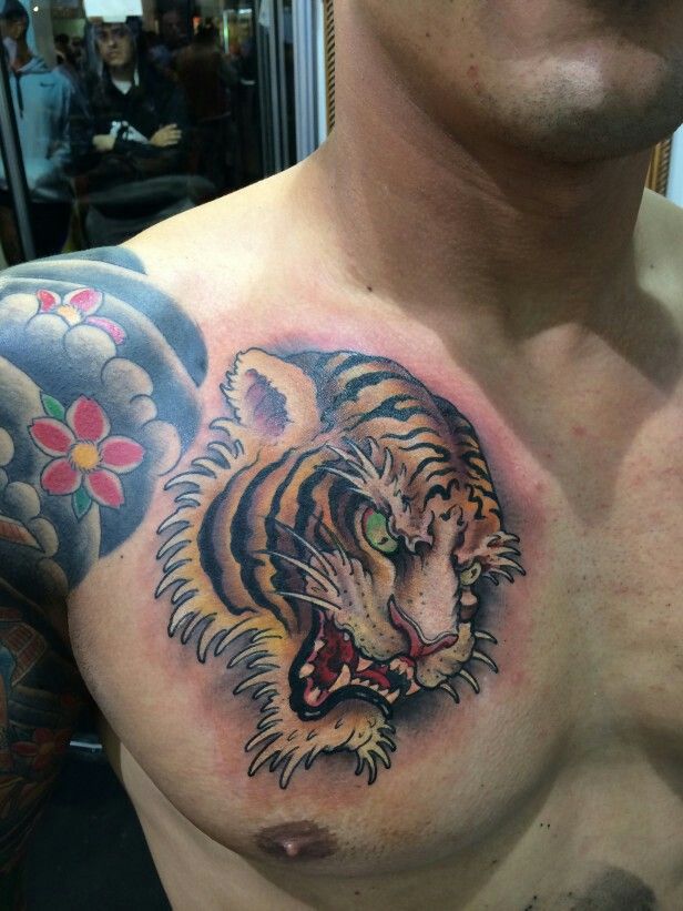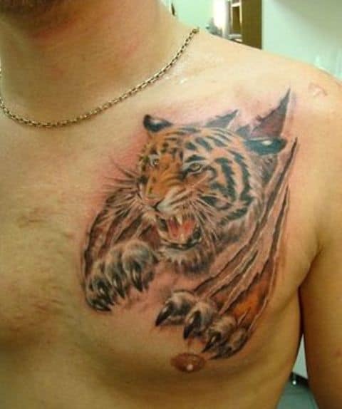 Татуировка тигра на груди — популярный выбор для татуировок на груди. Тигр считается национальным животным Индии. В Китае тигр считается «китайским богом», «царем всех животных» и «богом-защитником гор». Уход от проклятия злых духов и поведение тигра весьма показательно. Звери всегда были частью фольклора и мифологии Японии, которые управляют естественными силами дождя и ветра, чтобы приносить счастье и мир, что указывает на традиционную популярность.